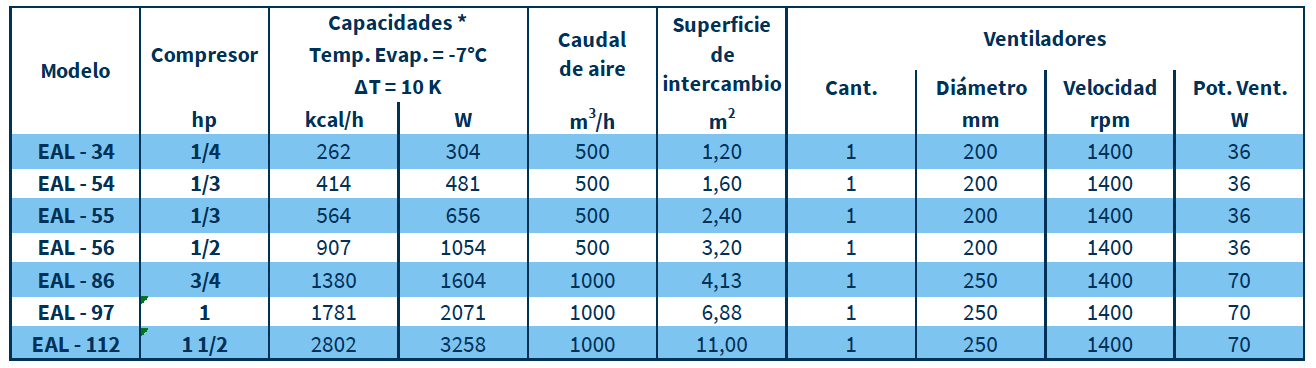 En todos los casos los caudales de aire fueron cuidadosamente estudiados en función de las superficies de transmisión para obtener la mayor eficiencia. Equipados con motores asincrónicos con polo de sombra, aislación clase B, y son monofásicos de 220 V / 50 Hz. Las rejillas protectoras tienen acabado epoxi y son construidas bajo las normas de seguridad vigentes.