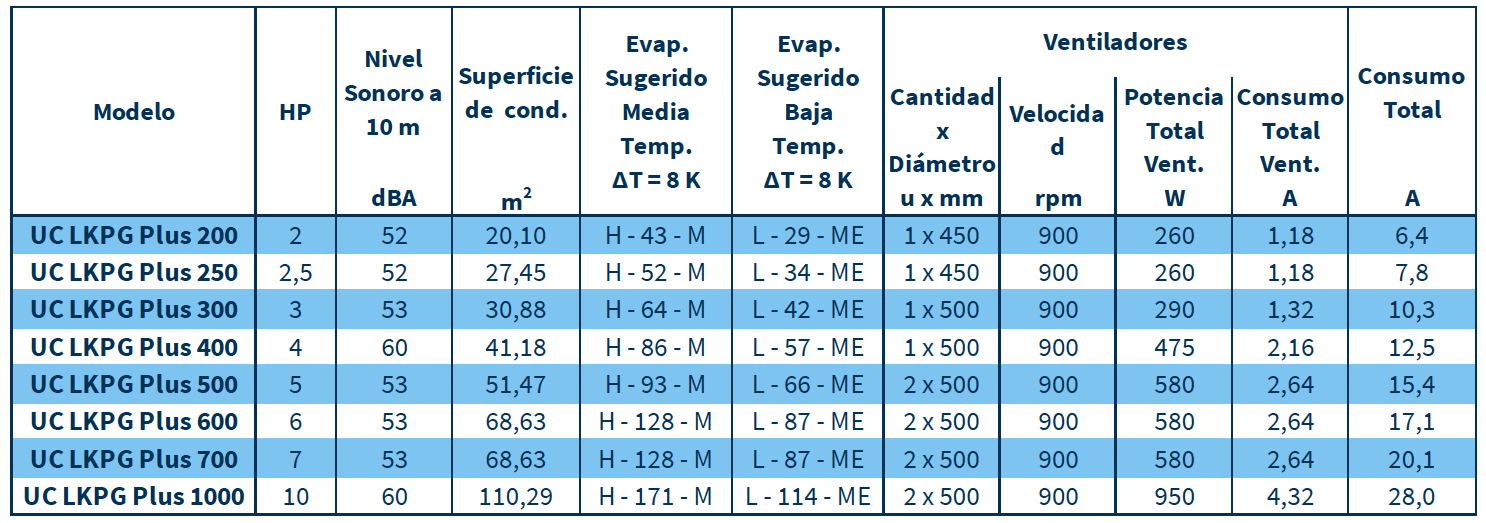 Las unidades condensadoras de esta línea cuentan con tubo recibidor, filtro deshidratador, válvula solenoide, visor de líquido, válvulas de servicio en línea de líquido y aspiración, contactora eléctrica, presostato de corte por alta y baja presión, manómetros en línea de alta y baja presión y protector de secuencia de fase.